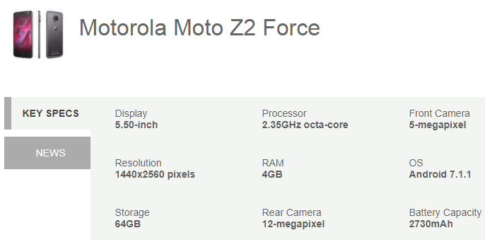 मोटो Z2 फ़ोर्स स्पेसिफिकेशन और दाम: